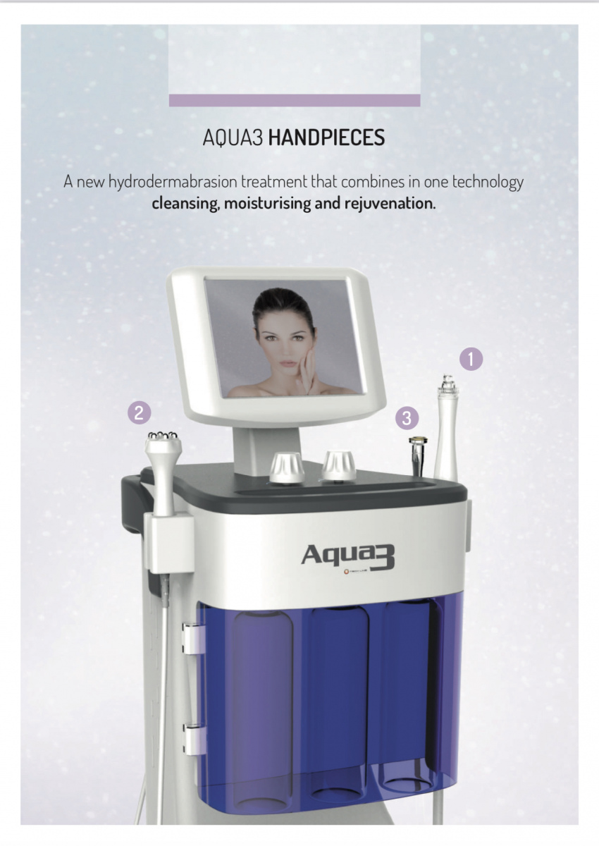 An Aqua3 Facial is a skincare treatment that combines 3 in 1 technology with the benefits of a water based peel containing sequential acids, microdermabrasion and the transdermal delivery of mesotherapy ingredients.
